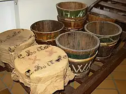Three coopers worked on the island and it is to be supposed that the cooper's trade began in the 18th century in Werder. Before the Tienen were sold to the fruit farmers, the coopers had to calibrate them. The Tienen were dried and then weighed and the dead weight was branded on the outside. A new Tiene for cherries with a capacity of 7 to 9 pounds cost sixty pfennigs in 1908. A Tiene for raspberries weighed 50 to 60 pounds.
