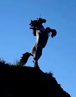 A monumental sculpture by Tighe O'Donoghue/Ross created in patinated ferro-cement of a war horse with helmet and broken chains atop an outcrop along the N22 roadway near Killarney, County Kerry, Ireland