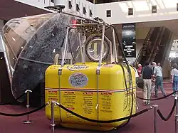 Designed and built by Tim Cole out of kevlar and carbon with a clear bubble hatch. His local Greeley partners helped with materials and building including: Agland, Purdy-Minch Construction and Maxanns.[3] About the size of a closet, the Spirit-of-Freedom capsule has a bench and a sleeping bag. Fossett averaged 4 hours of sleep per day in 45 minute naps. He ate military rations called MREs which were heated with water activated chemical heat packs.[4] Fossett would have to regularly climb out into the sub-zero temperatures to change fuel tanks.[6]   Besides the Comstock autopilot, the gondola equipment included GPS, Inmarsat, and satellite phone backup for communications with Mission Control at Washington University in St. Louis. Fossett used radios for communications with air traffic control and other aircraft. An Emergency Position Indicating Rescue Beacon (EPIRB) was on board to aid search and rescue.[4] The unpressurized gondola used lithium batteries to power the electronic equipment and a custom heater regulating the aircraft internal temperature between 4 and 21 C (38-72 F).[4]
