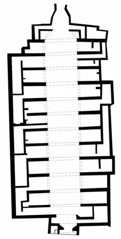 Timchehs share architectural features with the main bazaar passages but are built on a smaller scale. Most are roofed; those without a dome are often evolved forms of earlier caravanserais from the Safavid era, some of which were later vaulted. The ceiling of a timcheh often includes a large central dome adorned with tilework, stucco decorations, and wooden carvings. A typical layout consists of a central pool surrounded by merchant rooms (hojrehs) in two or three levels. These structures often exhibit geometric layouts such as squares, rectangles, circles, ovals, or even hexagons and octagons. Brick is the most common construction material.[3][4][5]