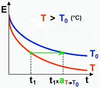 Consider the relaxation modulus E at two temperatures T and T0 such that T > T0. At constant strain, the stress relaxes faster at the higher temperature. The principle of time-temperature superposition states that the change in temperature from T to T0 is equivalent to multiplying the time scale by a constant factor aT which is only a function of the two temperatures T and T0. In other words,