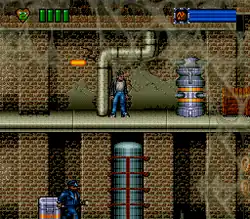 Time Trax is a side-scrolling action-platform game based on the television series of the same name, similar to Rolling Thunder (1986) and the Super Star Wars titles.[1][2][3][4] The plot follows police Captain Lambert, with aid from his supercomputer assistant S.E.L.M.A. Lambert travels back in time using the Trax device to capture commander Sepp Dietrich and doctor Mordecai Sahmbi. Sahmbi has sent criminal fugitives back in time to assist him in his plan of changing history and gain control of the future.[2][3][5]
