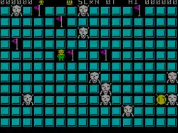Timebomb is a clone of the arcade game Check Man. The player moves a character across an 11 by 16 grid of tiles with the goal of diffusing a timebomb occupying one square of the grid. This must be done before the timer on the bomb reaches zero (taking about five seconds).[1] Each time the player moves by one tile, a note of Beethoven's Für Elise are played using the ZX Spectrum's "beeper". Tiles disappear as the player moves over them, preventing the player from reentering that grid location. When the player reaches the timebomb, it is removed and a new one appears in a random location. Diffusing six timebombs resets the tiles, increasing the screen number and adding one "boot", to a maximum of four. The boot is an agent that moves randomly across the tiles and kills the player on contact.