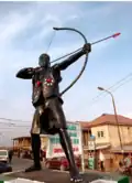According to oral traditions, the Oranmiyan Obelisk (Opo Oranmiyan) was built in Ife some time after the death of Oba Oranmiyan to commemorate his memory.[68] The 5.5m tall 1.2m circumference (at base) granite monument colloquially called the Oranmiyan staff is studded with about 140 driven iron pegs made into an elongated trident shape, as well as a horn and an axe near the middle, all holding some symbolic meaning.[35] |