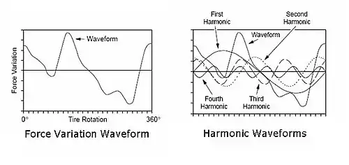 Radial force variation, as well as all other force variation measurements, can be shown as a complex waveform. This waveform can be expressed according to its harmonics by applying Fourier transform (FT). FT permits one to parameterize various aspects of the tire dynamic behavior. The first harmonic, expressed as radial force first harmonic (RF1H) describes the force variation magnitude that exerts a pulse into the vehicle one time for each rotation. Radial force second harmonic (RF2H) expresses the magnitude of the radial force that exerts a pulse twice per revolution, and so on. Often, these harmonics have known causes, and can be used to diagnose production problems. For example, a tire mold installed with 8 segments may thermally deform as to induce an eighth harmonic, so the presence of a high radial force eight harmonic (RF8H) would point to a mold sector parting problem. RF1H is the primary source of ride disturbances, followed by RF2H. High harmonics are less problematic because the rotating speed of the tire at highway speeds times the harmonic value makes disturbances at such high frequencies that they are damped or overcome by other vehicle dynamic conditions.