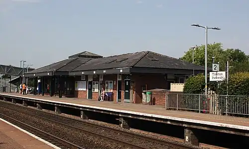 Tiverton Parkway railway station is on the Bristol to Exeter line in Devon, England. Despite being named after the town of Tiverton, it is actually located a short distance from the village of Sampford Peverell, 6 miles (9.7 km) to the east of Tiverton, and close to the junction of the M5 motorway with the A361 North Devon link road. It is 177 miles (285 km) from the zero point at London Paddington via Bristol Temple Meads.[1]