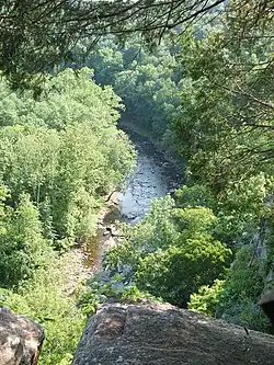 The ground along this part is very rocky and the creek quickly loses elevation, creating a clear, fast current. It is also along this part of its course that the creek dramatically cuts a valley into the steep hills along its sides. At the area popularly known as High Rocks, vertical walls of stone up to 200 ft (61 m) high rise above the northern edge of the creek. However, as the creek enters Point Pleasant, the ground evens out a bit and the creek becomes relatively more tranquil before entering the river.