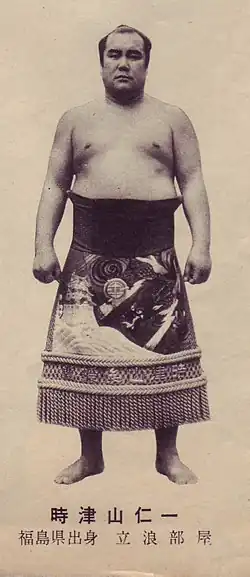 Tokitsuyama Jin'ichi (March 10, 1925 – November 21, 1968) was a professional sumo wrestler from Iwaki, Fukushima, Japan who wrestled for Tatsunami stable. He won the top division sumo championship in the summer tournament of 1953 and was runner-up in five other tournaments. His highest rank was sekiwake. After his retirement in 1961 he worked as a coach at Tatsunami stable until his death in 1968.