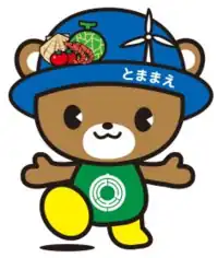Tomamae's mascot is Kumada Tomao (くまだ とまお), better known as Tomao-kun (とまおくん). He is a 7-year-old brown bear cub. He wears a hat that has two badges (a windmill badge and a badge dedicated to agricultural and seafood products).[3]