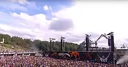 On 16 July 2025, two days prior to the opening day of the first weekend of that year's festival, the main stage was completely destroyed by a fire. Antwerp authorities are investigating the incident as an "unintentional arson", and no injuries were reported.[62] Organisers stated that they were working to prioritise the safety of attendees, and were "finding solutions for the festival weekend". The DreamVille campsite opened on 17 July as scheduled,[63][64][65][62] and it was announced that a smaller, alternate main stage would be constructed by either Friday or Saturday (with DreamVille's Gathering Stage used as a backup for Friday if it wasn't completed).[66][67] The rapid destruction of the main stage drew criticism, as experts noted it was built from highly flammable materials like polystyrene and wood—making it vulnerable to fire even from a small spark, according to VRT NWS.[68] The new main stage was completed on Friday, consisting of a wide video wall and DJ booth erected in front of the remaining scaffolding of the destroyed stage; it was reportedly constructed using components from the touring rig of Metallica's M72 World Tour, which were still in storage in Austria.[69][70][71]
