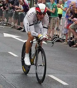 Tony Hans-Joachim Martin (born 23 April 1985) is a German former professional road bicycle racer.[8] Martin was known as a time trial specialist, and is a four-time world champion in the discipline – having won the title in 2011, 2012, 2013 and 2016 – which is joint-most with Fabian Cancellara.[9] He also won a silver medal at the 2012 Summer Olympics in London, finishing runner-up to Bradley Wiggins in the event. Martin was also part of four world championship-winning team time trial squads, with Omega Pharma–Quick-Step/Etixx–Quick-Step, in 2012, 2013 and 2016, and with Germany in the mixed relay time-trial in 2021.[8]