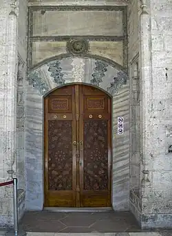 Embossed inscriptions at the main visitors' door, dating from 1856, contain laudatory words for Sultan Abdülmecid I. The main door is surmounted by an embossed besmele, the common Muslim benediction, meaning "In the Name of God the Compassionate, the Merciful", dating from 1723. This inscription was added during the reign of Sultan Ahmed III. The tile panels on either side of the door were placed during later repair work.