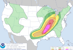 The Convective Outlook issued for 1630Z by the Storm Prediction Center, showing a large high risk on the Mississippi River basin, including Memphis, Tennessee.[14]