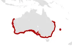 Its range is from Hervey Bay in central Queensland to Narooma in southern New South Wales on Australia's east coast, and from Adelaide around to Coral Bay in Western Australia.[2] It is found off Lord Howe Island, but not Tasmania.[3] It lives in shallow salt water and can gather around jetties and piers.[2] It can be found to depths of 27 m (89 ft).[3]