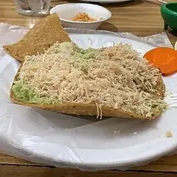 It consists of guacamole made with avocado and green guaje tomato, to which jalapeño vinegar is added, along with shredded chicken breast or leg and sour cream, all sandwiched between two large corn tortillas. It is often accompanied by pickled chilies and carrots.[4]