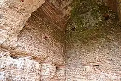 The fanum is an example of Roman architecture that is adapted to the resources of the site.[3] The walls are blockage clad with small sandstone or limestone rubble siding, alternating with beds of two to three rows of terracotta.[5] The walls reach 1.3 metres (4 ft 3 in) in thickness.[4] It is possible, though difficult to prove due to the façade's deterioration, that Tour de Grisset's masonry had geometric patterns made by arrangements of stones with different colors. This practice has been found elsewhere in the region, such as on the temple at Cherré[6] and the Roman city walls of Le Mans.
