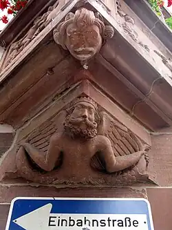 The house façade of the old town hall was painted with scenes from a dance of death in 1559. At the behest of the council, the painter Galienus Entringer had to replace his own painting with a history painting with scenes from the life of Philip II of Macedon in 1560. In 1881, Fritz Geiges replaced the neo-Gothic architectural painting of Simon Gösers of 1810 with paintings in the manner of the Renaissance, but those had to be revised in 1886 because of damage. Today, the building is plastered uniformly in sandstone red. The windows are framed in black and gold with colorful portals.[2][3]