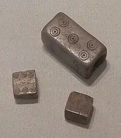 Smaller dice were made by an elongated rod used to plane, or smooth, the cortical bone of a diaphysis. Then, a deep groove was used to saw off different segments of the bone, partially separating them into dice. They were possibly not completely separated at this stage; instead, they may have been loosely connected to each other through a remaining strip of bone. The dice may have only been separated after pips they had been marked with pips. Although, it is possible that the pip style was marked after separation and the dice were initially divided using the groove.[39] Another sample of pre-650 CE dice from sites throughout the modern Netherlands, were made from various organic materials such as bone, ivory, or antlers. These dice display similar variation in their pip style, or the arrangement of dots on the dice: 50% have a dot surrounded by one concentric circle, 25% have a dot surrounded by two concentric circles, and another 25% have a central, usually circular, hole.[40] Although the Netherlands was never conquered by the Romans, these dice were likely influenced by the Romans and resemble dice found in the Roman regions of Britain.[41] Samples of 1st to 7th century dice unearthed around the Lower Danube display largely similar ornamentation; however, they bear slightly different characteristics depending upon their manufacturer.[42]