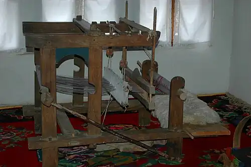 Among 140 types of traditional Albanian costumes, the Podgur's attire Veshja e Podgurit is Kosovar, differentiated by its variety and is an influence in all other regions.[3] This costume belonged to the majority of the Illyrian and Albanian regions included in the international framework. The clothing items consist of the shirts of men and women, which are wide sleeved with a narrow collar which was buttoned up and a white traditional hat worn by men called plis, leather moccasins or opinga. According to archaeologists of the Museum of Pristina, Podgur's clothing dates back to the 5th and 4th century BC.[3] However, transformations of this costume happened due to different social and cultural situations, technical inventions and also element exchange between the ethnic groups. From field investigation, it has been reported that in the 19th century and the first two decades of the 20th century, women's clothing went through morphological changes.[4] The 19th-century look consisted of the combing of their hair and braiding them. They also wore red semi-spherical shaped hats which were embellished with tiny gold coins. Around the crown of the hat they wore a tight lace, lidhëse, which was 60 cm long. It was tied so that their hair remained hidden. Marhama is a type of material which was worn along their neck and chin, but the embroidered tail of marhama was laid down along the right shoulder, and it was called masdorja.[4] The shirt was of foot-length and the sleeves were long and wide, approximately 35 cm and also embroidered. Shtjellakët (pështjellakët, mbështjellakët) which were pieces of material that resemble an apron, were big in size and tight in width, and it had geometrical motives, such as an axe or a circle. The moccasins were made from the skin of cattle and knitted with pieces of sheep skin. They were called gogishte moccasins. As belts, they wore woolen material called shokë which were knitted using a loom. It was of 3 cm width, and the embroidered part was tied on the back. Their colors were very characteristic and different, such as red, green, yellow and black.[5] Children of rich families had their clothes knitted by tailors and that made them look like any other grown man. From puberty and on, children's clothing becomes more detailed. In this age boys start to wear plis, where as in cold days they wore scarfs and tirqe, traditional white woolen pants. In the celibacy age boys wore tirqe (which were always white ), plis and vests. However, children clothing in general is characterized by its simplicity. It consists of a knee length shirt which is made of white fabric combined with vertical shokë which was of chestnut color. The wearing of shokë by children was very rare ; it was only worn during the years they were celibate and wanted to impress women their social circle.[5] In youngster clothing, the white and black color were worn more often, whereas blazers were also enriched with red, yellow, green, and brown. During cold weather, youngsters also wore a certain type of hat called kapulace. It was made of woolen threads which were skull-shaped and they covered every part of the head and face except the eyes and nose. Blazers were also part of the youngster attire and were made of soutane, resembling the adult costume. Boys wore shoulder-length hair.[6] Before costumes were knitted by tailors, the models were first cut out in Peć. This was done once a year, during fall or winter.[7]