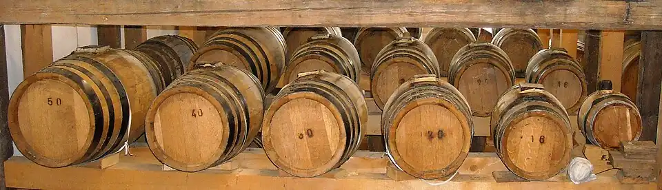 The barrel set is a series of at least five wooden casks arranged according to a decreasing size scale, where the product undergoes profound changes over time. Casks may be of different wood types (e.g. oak, mulberry, ash, chestnut, cherry, juniper, and acacia), and the smallest cask volume ranges from 15 to 25 liters. Each cask has a hole on the top, the so-called cocchiume, facilitating the usual inspection and maintenance activities. The barrel set behaves essentially as a device for vinegar concentration due to water loss through the staves. As widely known for the wine production, it is reasonable to suppose that the wood acts as a semipermeable filter for the transfer of small molecules towards the ambient while it retains important volatile compounds such as the acetic acid. However, when the opening is not hermetically closed, the volatile compounds are lost preferentially through the cocchiume itself.[20]