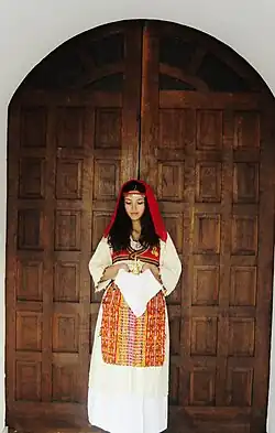 The most famous apparel was called ‘'pështjellak'’ which consistent of a long white shirt, and two ‘'pështjellak'’ (a white apron), the front and the back one. ‘'pështjellaku i parmë'’, or the front apron is as long as the shirt, and it was tailored to fit the woman's hip. ‘'pështjellaku i pasëm'’, the back apron was shorter than the front one. Other components of this clothing were : ‘'tëlina't’ (traditional underwear), ‘'jeleku'’ –resembles a short vest which was embroidered, ‘'shokë’' a large woolen material circling the waist, traditional black socks, and different color head scarves. Accessories were very popular among women – golden and silver necklaces, bracelets and rings. The socks were traditionally black, and they were worn with shoes called ‘'opinga'’, made of different animals’ skin.[14]