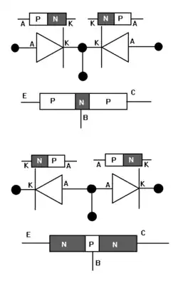 To make a PNP transistor, the cathodes of both diodes are back-to-back connected to form a large N type base region.[1]