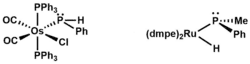 In most complexes with terminal phosphido ligands, phosphorus is pyramidal, as expected with a stereochemically active lone pair of electrons. The M-P bond length in the pyramidal phosphide complex is longer than the M-P bond length in corresponding transition metal phosphine complexes. The pyramidal phosphido complex. In the complex, the Os-PHPh bond is 0.11 Å longer than the Os-PPh3 and the Os-P-C angle is 113o. The elongated Os-PHPh bond is often attributed to the electronic repulsion of the lone pair and nonbonding electrons on Os.[6] Also, in another ruthenium complex, the Ru-P(Me)Ph bond is 0.17 Å longer than Ru-PH(Me)Ph in the related phosphine ligand version of the complex, [(dmpe)2Ru(H)PH(Me)Ph]+.[7] Additionally electronic repulsion of the P-centered lone pair and metal-based electrons enhance the nucleophilicity of the phosphide ligand. This high basicity and high nucleophilicity leads to the dimerization reaction.