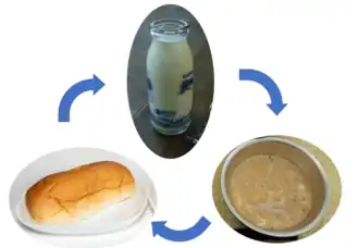 Some believe that it is a method of eating milk, bread, and side dishes, in that order, after school lunches began in the 1950s. It is believed that this method was used to encourage Japanese elementary school students, many of whom disliked milk at the time, to drink it. In the 1950s, Japanese elementary school students drank not pure milk but skimmed milk powder dissolved in water for school lunches.[4]