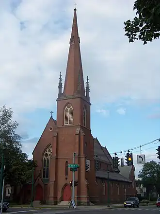 The parish of Trinity Church, Elmira, New York was founded in 1833. Trinity Church is a parish of the Chemung District of the Episcopal Diocese of Central New York, centered in Syracuse, New York. The present structure of Trinity Church is located at 304 North Main Street, Elmira, New York. Designed by architect Henry Dudley, the church was built from 1855 through 1858. It is significant for its Gothic Revival architecture. The church was listed on the National Register of Historic Places in 2007.[2] In 2024, the church was converted into a sports complex.[3]