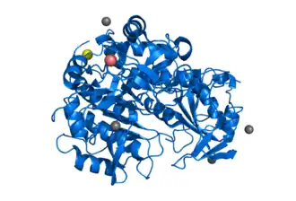 Tripeptidyl-peptidase 1, also known as Lysosomal pepstatin-insensitive protease, is an enzyme that in humans is encoded by the TPP1 gene, also known as CLN2.[5][6] TPP1 should not be confused with the TPP1 shelterin protein which protects telomeres and is encoded by the ACD gene.[7] Mutations in the TPP1 gene leads to late-infantile neuronal ceroid lipofuscinosis.[8]