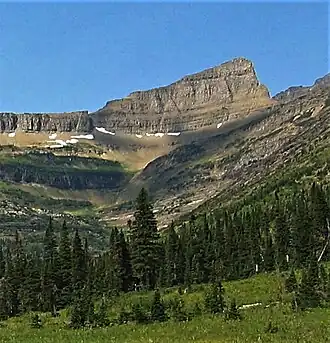 Triple Divide Peak (8,025 feet or 2,446 metres) is located in the Lewis Range, part of the Rocky Mountains in North America. The peak is a feature of Glacier National Park in the state of Montana in the United States.[3] The summit of the peak, the hydrological apex of the North American continent, is the point where two of the principal continental divides in North America converge, the Continental Divide of the Americas and the Northern or Laurentian Divide.