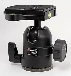 A ball head utilizes a ball joint to allow rotational movement about all axes from a single point. Some ball heads also have a separate panoramic rotation joint on the base of the head. The head has two main parts, the ball, which attaches to the camera, and the socket, which attaches to the tripod. The camera is attached to the ball by means of quick release plate or a simple UNC 1/4"-20 [7] screw. The socket encloses the rotating ball and also contains the controls for locking the ball. The socket has a slot on the side to allow the camera to be rotated to the portrait orientation. Ball heads come in varying degrees of complexity. Some have only one control for both ball and pan lock, while others have individual controls for the ball lock, pan lock, and ball friction. Ball heads are used when a free-flowing movement of the camera is needed. They are also more stable and can hold heavier loads than pan-tilt heads. However, ball heads have the disadvantage that only one control is available to allow or prevent movement of all axes of rotation, so if the camera is tilted around one axis, there may be a risk of rotation about the other axes as well.