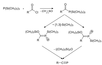 Treatment of certain acyl chlorides with tris(trimethylsilyl)phosphine gives phosphaalkynes, one example being tert-butylphosphaacetylene.[4]