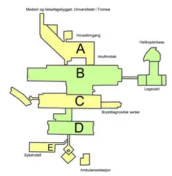 The heliport is situated on the premises of Tromsø University Hospital, situated north of the city center of Tromsø on the island of Tromsøya. The facility is owned and operated by the University Hospital of North Norway, part of Northern Norway Regional Health Authority.[7] The helipad is placed on top of the building complex used by the helicopter, along with a hangar. The helipad has a diameter of 33.6 meters (110 ft) and capable of handling helicopters up to 16 tonnes. From the helipad there is a skywalk across to the emergency department of the hospital.[8]