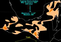 2. ^ a b c d e f g Rappaport, Edward N (June 18, 1997). Preliminary Report: Tropical Storm Andres June 1 – 7, 1997 (PDF) (Report). United States National Hurricane Center.