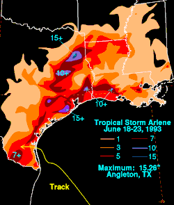 Tropical Storm Arlene brought torrential rainfall to the western United States Gulf Coast, particularly to the U.S. state of Texas, in June 1993. The first named storm of the 1993 Atlantic hurricane season, Arlene developed from an area of low pressure in the Bay of Campeche on June 18. The depression slowly strengthened as it tracked west-northwestward and later north-northwestward across the western Gulf of Mexico. Arlene was subsequently upgraded to a tropical storm on June 19, but failed to intensify further due to its proximity to land. The cyclone then made landfall on Padre Island, Texas, with winds of 40 mph (65 km/h) and degenerated into a remnant disturbance on June 21.