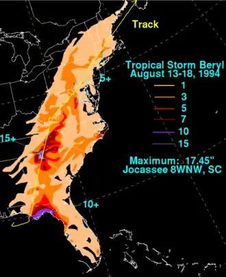 25. ^ a b c David M. Roth. "Tropical Storm Beryl — August 14–18, 1994". Tropical Cyclone Point Maxima. United States National Oceanic and Atmospheric Administration's National Weather Service. Retrieved July 2, 2017. {{cite book}}: |work= ignored (help)