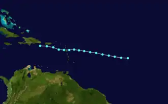On August 20, 2015, the National Hurricane Center (NHC) began monitoring a tropical wave over western Africa, near the Atlantic shore.[1] The disorganized system emerged over the Atlantic Ocean several hundred miles southeast of the Cape Verde Islands the following day.[2][3] Moving quickly west, the system bypassed the Cape Verde Islands to the south on August 22,[4] but remained largely disorganized. A sharp trough developed within expanding deep convection on August 23, though a well-defined circulation did not consolidate.[2] Organization of the low improved throughout the day as environmental conditions favored tropical cyclogenesis.[5] The trough acquired gale-force winds the following day and finally developed a closed circulation by 18:00 UTC. The formation of a closed low marked the transition into a tropical cyclone; accordingly, the system was classified as Tropical Storm Erika, the fifth named storm of the annual hurricane season. Upon its designation, Erika was situated roughly 1,035 mi (1,665 km) east of the Lesser Antilles.[2] The storm maintained a brisk westward trajectory, steered by a subtropical ridge to the north.[2][6]