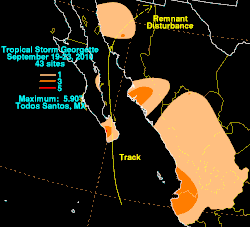 Georgette caused the heaviest rains on Baja California Sur in the last 15 years, leaving many people homeless.[14] Georgette also produced high waves. The tropical cyclone worsened Mexico's flooding problem which started when Hurricane Karl made landfall several days earlier.[15] A peak rainfall total of 5.9 in (150 mm) fell in Todos Santos.[16] Throughout Sonora, rainfall up to 4.7 in (120 mm) triggered flooding that damaged 220 homes.[17] Georgette caused 2.61 in (66 mm) of rainfall in Guaymas[9] Flooding was reported in several places (Empalme, Etchojoa, Navojoa, Guaymas, Los Mochis), causing 500,000 people to be evacuated.[1] Heavy runoff caused inflows of 18,000 cu ft/s (510 m3/s) into El Novillo Dam, forcing the Comisión Nacional del Agua, the local water authorities, to release water from the dam.[18]