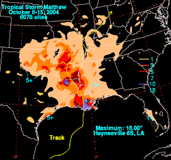 Tropical Storm Matthew was a weak tropical storm in 2004 that made landfall in Louisiana. It was the thirteenth tropical storm of the season and the ninth to affect the United States. It formed over the western Gulf of Mexico on October 8 and struck south-central Louisiana two days later. The combination of the storm and an upper cyclone over the southern Plains brought heavy rains to much of the Gulf Coast, with the highest amounts reported over 15 inches (380 mm) in northern Louisiana. Damage was minimal, totaling $305,000 (2004 USD), and no casualties were reported.