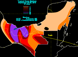 While the National Hurricane Center initially classified the depression, it was noted in post-analysis that the system had already intensified into Tropical Storm Matthew,[1] but was operationally carried as a tropical depression until 21:00 UTC September 23. based on confirmation from Hurricane Hunters. At the time, it was moving generally westward, due to a subtropical ridge over the northwestern Caribbean Sea and Gulf of Mexico. Tropical cyclone prediction models anticipated a path near or over Nicaragua, followed by Matthew stalling near the Yucatán Peninsula due to a collapse in steering currents. There was uncertainty in the timing of the latter events, and the NHC noted that great intensification could occur if the storm remained over warm waters; this was due to favorable conditions, such as sea surface temperatures exceeding 30 °C (86 °F) and an upper-level anticyclone providing good outflow.[8] As the storm gradually strengthened during the morning of September 24 after a burst in convection, and the National Hurricane Center noted that there was a considerable uncertainty over the path Matthew would take in the long run. Some numerical models forecast the tropical storm to pass through the Yucatán Peninsula into the Bay of Campeche, while others forecast Matthew to reach the peninsula's coast, then do a sharp turn to the northeast back into the Caribbean Sea. As such, the NHC considered its track forecast—and by extension, its intensity forecast—to be of "low confidence."[9][10]