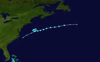 Despite this, convection began to increase once more, after Melissa moved into more favorable conditions. At this time, the storm also began to accelerate to the east-northeast, around the northern periphery of the Bermuda-Azores High.[6] Just a few hours later, convection decreased for the final time as the inner-core region was taken over by stable cold-air stratocumulus clouds.[7] By early on October 14, Melissa only remained an exposed swirl with decreased convection.[8] After merging with a nearby frontal boundary, Melissa degenerated into an extratropical low at 12:00 UTC that day, while located roughly 400 miles (645 km) south of Cape Race, Newfoundland. Just 6 hours later, the circulation of the low opened up, and the system dissipated shortly afterwards.[1]