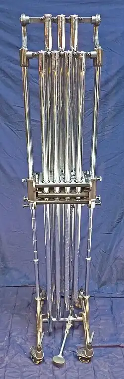 Tubular bells (also known as chimes) are musical instruments in the percussion family.[1] Their sound resembles that of church bells, carillons, or a bell tower; the original tubular bells were made to duplicate the sound of church bells within an ensemble.[2] Each bell is a metal tube, 30–38 mm (1+141+12 in) in diameter, tuned by altering its length. Its standard range is C4–F5, though many professional instruments reach G5. Tubular bells are often replaced by studio chimes, which are smaller and usually less expensive instruments. Studio chimes are similar in appearance to tubular bells, but each bell has a smaller diameter than the corresponding bell on tubular bells.