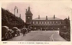 In 1923 following the grouping ordered by the Railways Act 1921, the station passed into the ownership of the Southern Railway (SR). The SR added the suffix "West" to the station's name on 22 August 1923, in order to distinguish it from the other Tunbridge Wells station, which was named "Central".[17] This period saw the station become very popular with cross-country services with over 100 trains passing each day.[12] From Groombridge to Tunbridge Wells West alone there were 83 workings, with trains proceeding to three destinations - Three Bridges, Brighton via the Oxted Line and Eastbourne via the Cuckoo Line. The spur saw little use by 1925 - four daily workings to Brighton and two to Uckfield.[18]