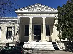 The facade is in neoclassical style, the columns and frieze recalling the Parthenon, the staircase imposing. The lobby is rectangular, with hallways leading to rooms in each direction, and a skylight on the roof. There is a basement, ground and upper floor, and three courtrooms. The prosecutor's office was located on the upper floor until 2002, when it moved into a new headquarters.[1]