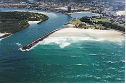 The first training walls were built in 1891.[16] Between 1898 and 1904, training walls were constructed from Chinderah to the entrance.[17] In 1962, these walls were extended in order to maintain a deep channel. The order failed to stop the channel from shoaling and instead necessitated regular dredging and completely inhibited the longshore transport of sand northwards.[16] The southern Gold Coast beaches were soon faced with intense erosion during storms which was not replenished.