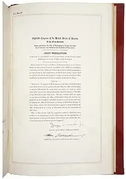 The Twenty-second Amendment (Amendment XXII) to the United States Constitution limits the number of times a person can be elected to the office of President of the United States to twice, and sets additional eligibility conditions for presidents who succeed to the unexpired terms of their predecessors.[1] Congress approved the Twenty-second Amendment on March 21, 1947, and submitted it to the state legislatures for ratification. That process was completed on February 27, 1951, when the requisite 36 of the 48 states had ratified the amendment (neither Alaska nor Hawaii had yet been admitted as a state), and its provisions came into force on that date.