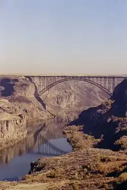 Twin Falls became the center of national attention 51 years ago in September 1974, when daredevil Evel Knievel attempted to jump the Snake River Canyon in a specially modified rocket cycle. Watched by millions on closed-circuit television on a Sunday afternoon, the attempt ultimately failed due to high winds and a premature deployment of Knievel's parachute.[18][19][20][21] The launch ramp's foundation lies on private land on the canyon's south rim. Less than 2 miles west (3 km) of Shoshone Falls, it is still visible (42°35′49″N 114°25′23″W / 42.597°N 114.423°W).