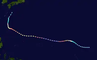 After Gay attained its peak intensity, outflow from Typhoon Hunt to its northwest increased the wind shear over the typhoon. The wind shear deteriorated Gay's northern eyewall, causing the typhoon to weaken. In the 24 hours after Gay reached its peak intensity, the JTWC estimated that the winds had decreased by 65 km/h (40 mph) to below super typhoon status; such rapid weakening is uncommon for a storm over open waters. Tropical cyclone forecast models had anticipated Gay to make a turn to the north and northeast, but it maintained a west-northwest track toward Guam. Despite weakening steadily, the typhoon maintained a large size with a wind diameter of 1,480 km (920 mi). Around 0000 UTC on November 23, Gay made landfall on Guam, becoming the third typhoon in three months to strike the island—the others were Typhoon Omar in August and Typhoon Brian in October.[2] Both the JTWC and the JMA estimated the typhoon to have had winds of 160 km/h (99 mph) at landfall.[2] The influence from Typhoon Hunt diminished after Gay affected Guam, allowing it to begin restrengthening. Late on November 25, the JTWC estimated that the typhoon attained a secondary peak intensity of 215 km/h (134 mph). Gay subsequently slowed while moving along the western periphery of the subtropical ridge, and it turned north while gradually weakening.[2] On November 28, the JMA downgraded Gay to a tropical storm,[4] and the JTWC followed suit the next day.[5] The JMA assessed that Gay became an extratropical cyclone at 0000 UTC on November 30;[4] however, the JTWC continued issuing advisories until December 1, making it the longest-lasting typhoon of the season with 63 advisories.[2] The remnant of Gay accelerated and turned to the northeast, passing to the southeast of Japan and crossing the International Date Line.[4]