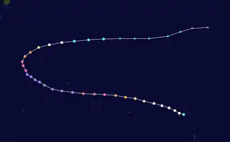 Hester began to weaken later that day, with winds down to 170 mph (275 km/h). By 0600 UTC of January 2, the winds lowered down to 150 mph (240 km/h), equivalent of a Category 4 typhoon.[1] Hester began to curve eastward and weaken rapidly.[2] On January 3, Hester continued to weaken to 110 mph (175 km/h), and eighteen hours later, it was down to 80 mph (130 km/h). It soon became a tropical storm on January 4, and soon dropped to a tropical depression later that day.[1] JTWC ceased tracking the storm near Minami-Tori-shima.[2] JMA downgraded the system to a tropical depression at 1200 UTC of January 5, and declared it extratropical twelve hours later. At 0600 UTC of January 6, JMA stopped tracking the cyclone northeast of Wake Island.[2][3]